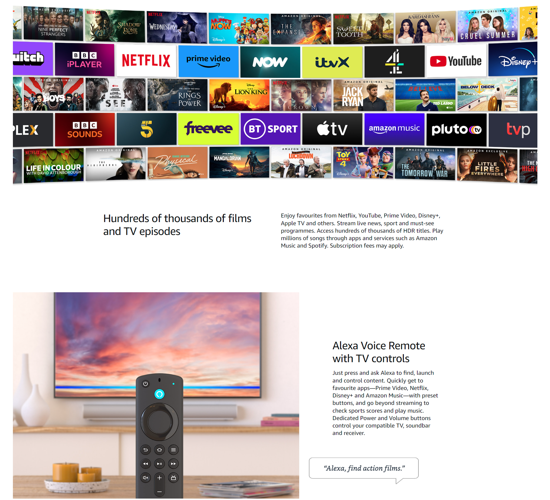 - Endless entertainment: stream hundreds of thousands of films and TV episodes from BBC iPlayer, Netflix, Prime Video, Now, Disney+ and more, plus listen to millions of songs. Subscription fees may apply.