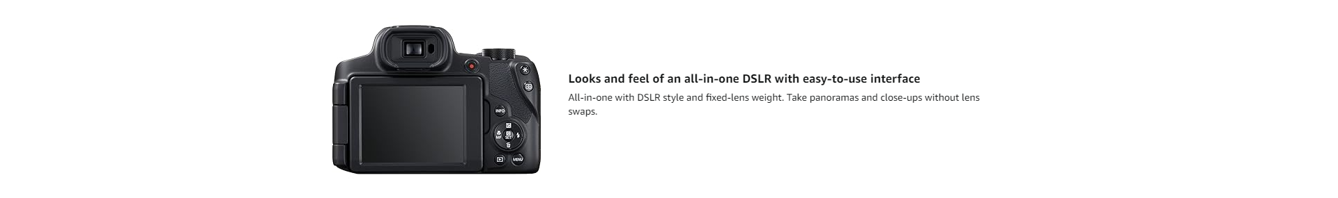 - Looks and feel of an all-in-one DSLR with easy-to-use interface