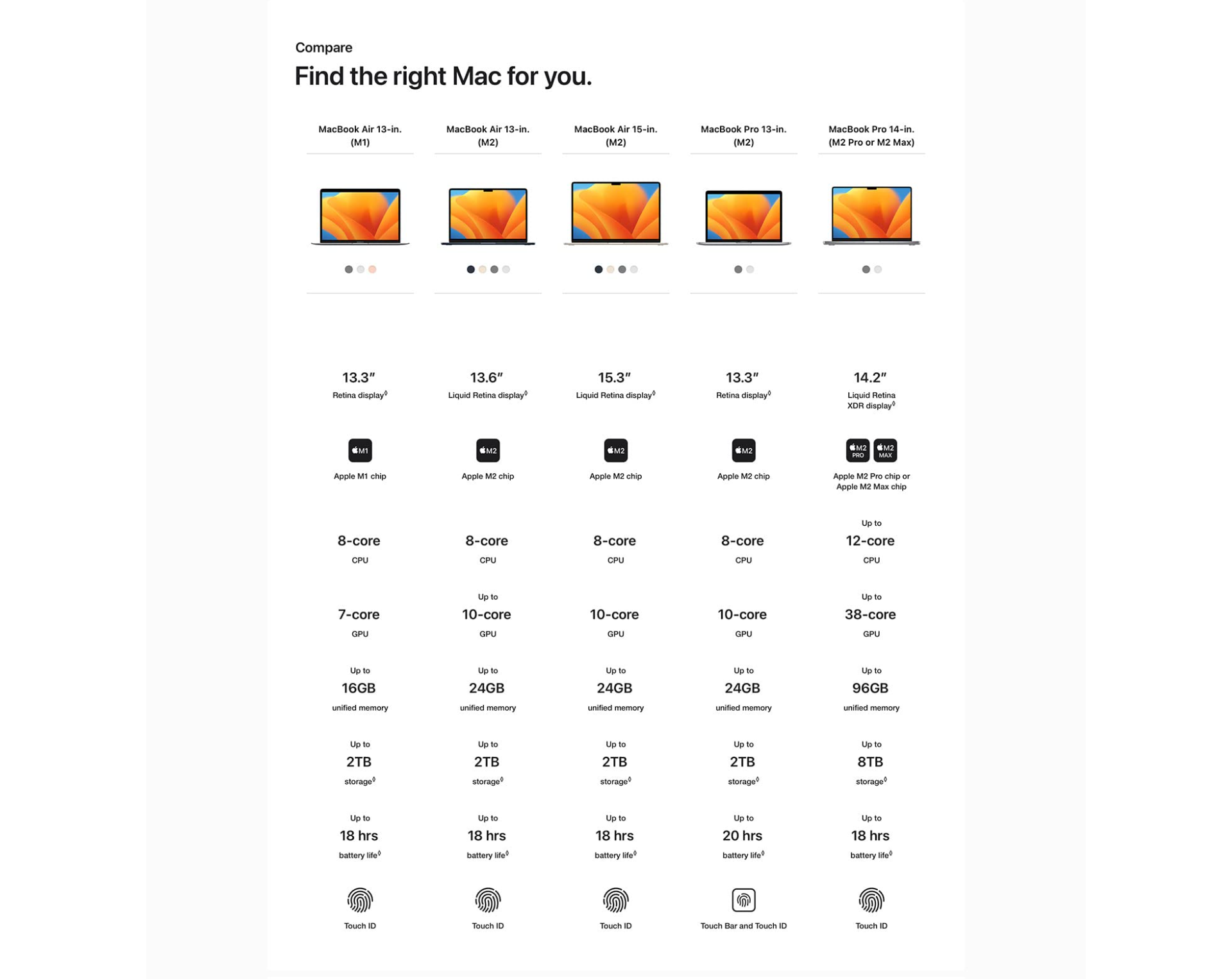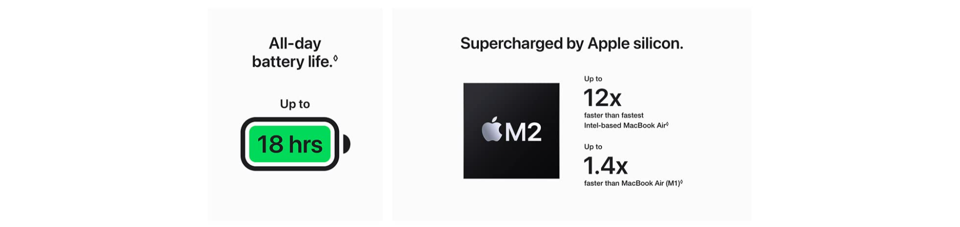 • UP TO 18 HOURS OF BATTERY LIFE — Go all day with the power-efficient performance of the Apple M2 chip. (Battery life varies by use and configuration. See apple.com/uk/batteries for more information.)