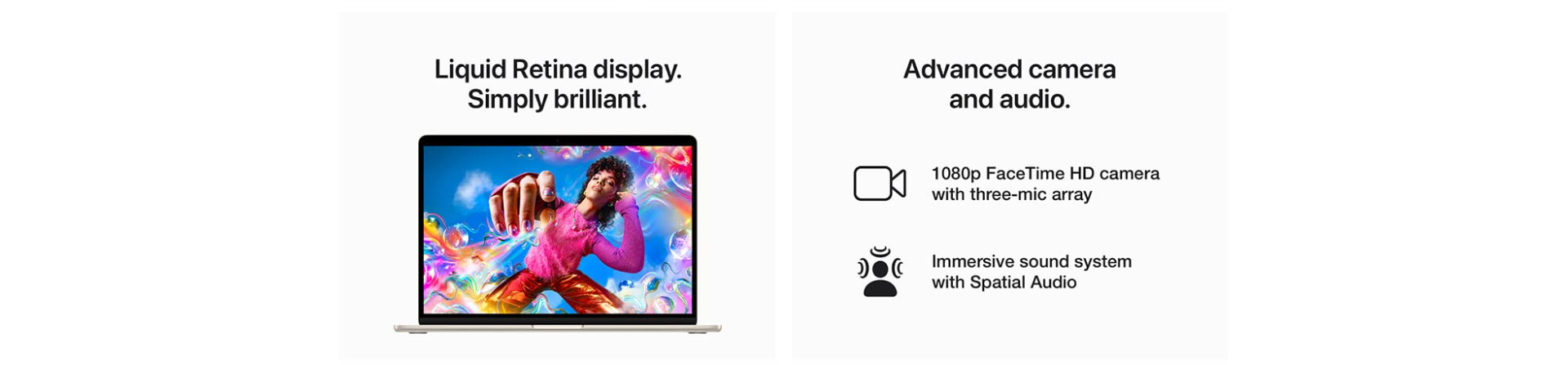 • SPACIOUS, BEAUTIFUL DISPLAY — The high-resolution, 15.3-inch Liquid Retina display features 500 nits of brightness, P3 wide colour and support for 1 billion colours, for vibrant images and incredible detail. (The display on the 15-inch MacBook Air has rounded corners at the top. When measured as a standard rectangular shape, the screen is 15.3 inches diagonally; actual viewable area is less.)