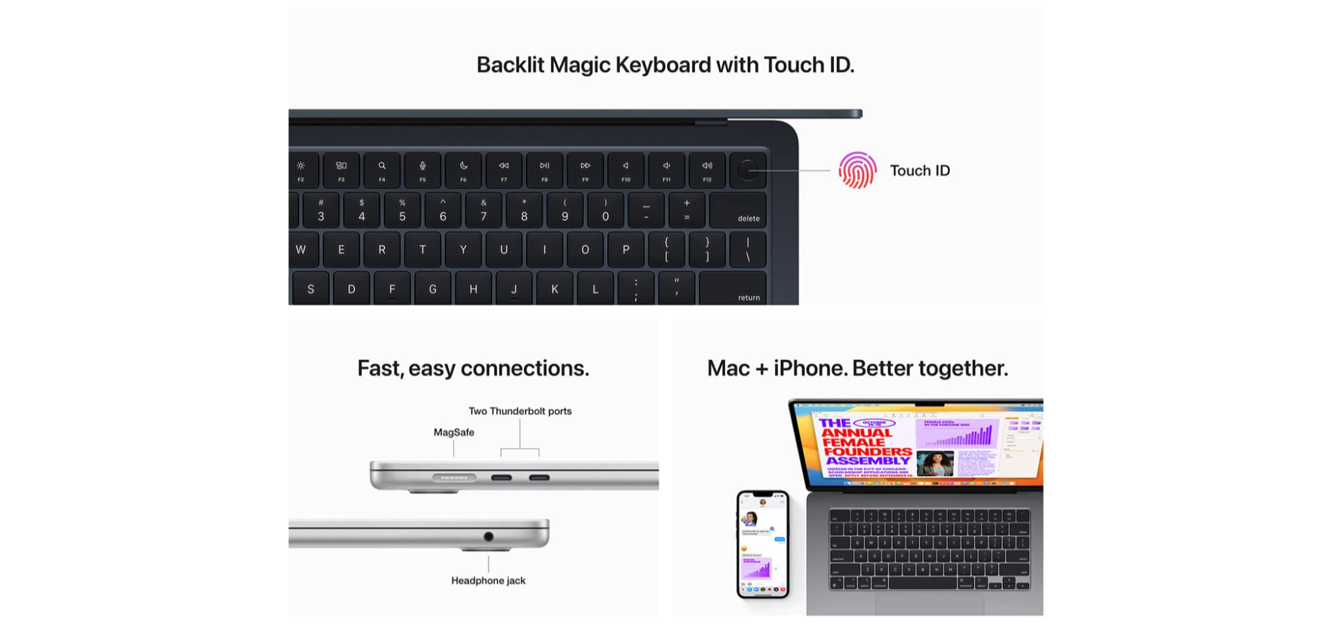 • IMPRESSIVELY BIG, IMPOSSIBLY THIN — The 15-inch MacBook Air makes room for more of what you love with a spacious Liquid Retina display. The durable, 100 per cent recycled aluminium enclosure is strikingly thin and light.