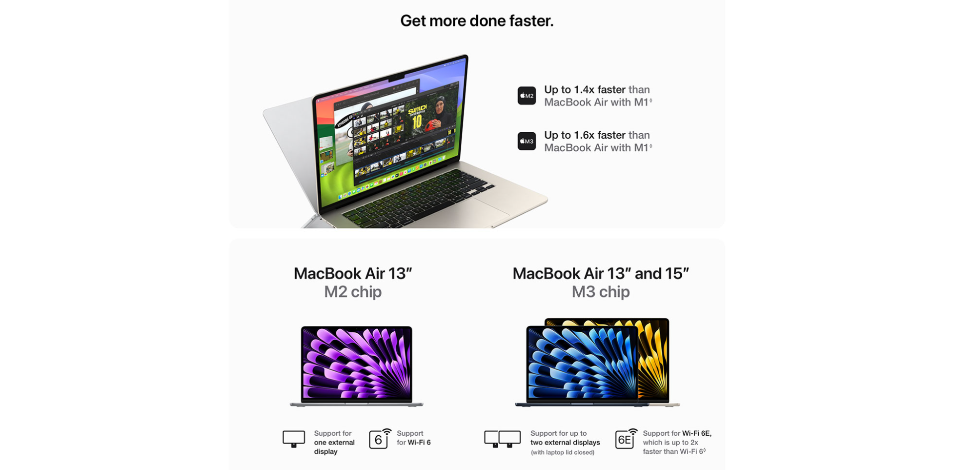 - GET CONNECTED — MacBook Air features two Thunderbolt ports, a headphone jack, Wi-Fi 6E, Bluetooth 5.3 and a MagSafe charging port. And connect up to two external displays with the laptop lid closed.