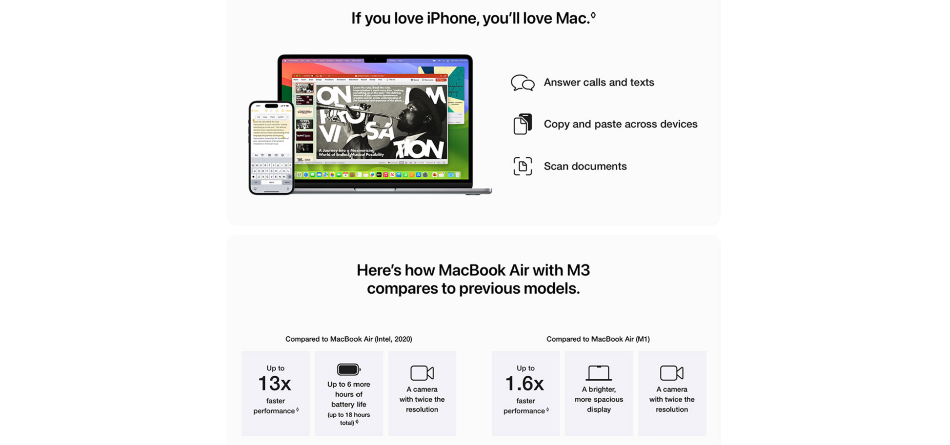 - IF YOU LOVE IPHONE, YOU’LL LOVE MAC — MacBook Air works like magic with your other Apple devices. Start an email on your iPhone and finish it on your Mac. Send text messages from your Mac. And much more.