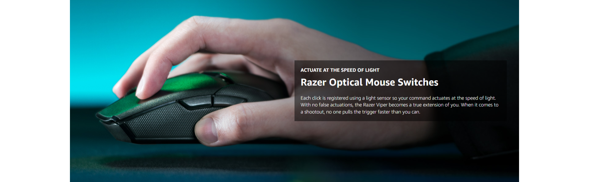 - Razer Optical Mouse Switch For actuation at the speed of light: Every click you make is actuated at the speed of light with no debounce delay, so you’ll always be the first to pull the trigger. The switches are also durable for up to 70 million clicks