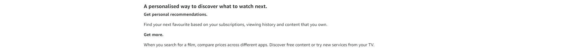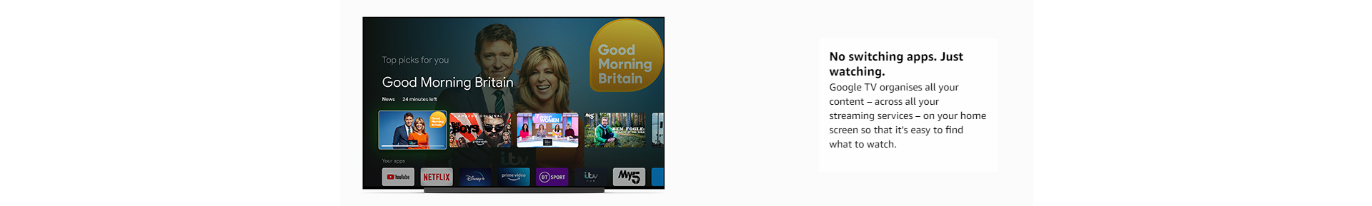 - No jumping, Just watching, Your home screen displays films and TV programmes from all your services in one place, No more switching between apps to decide what to watch.