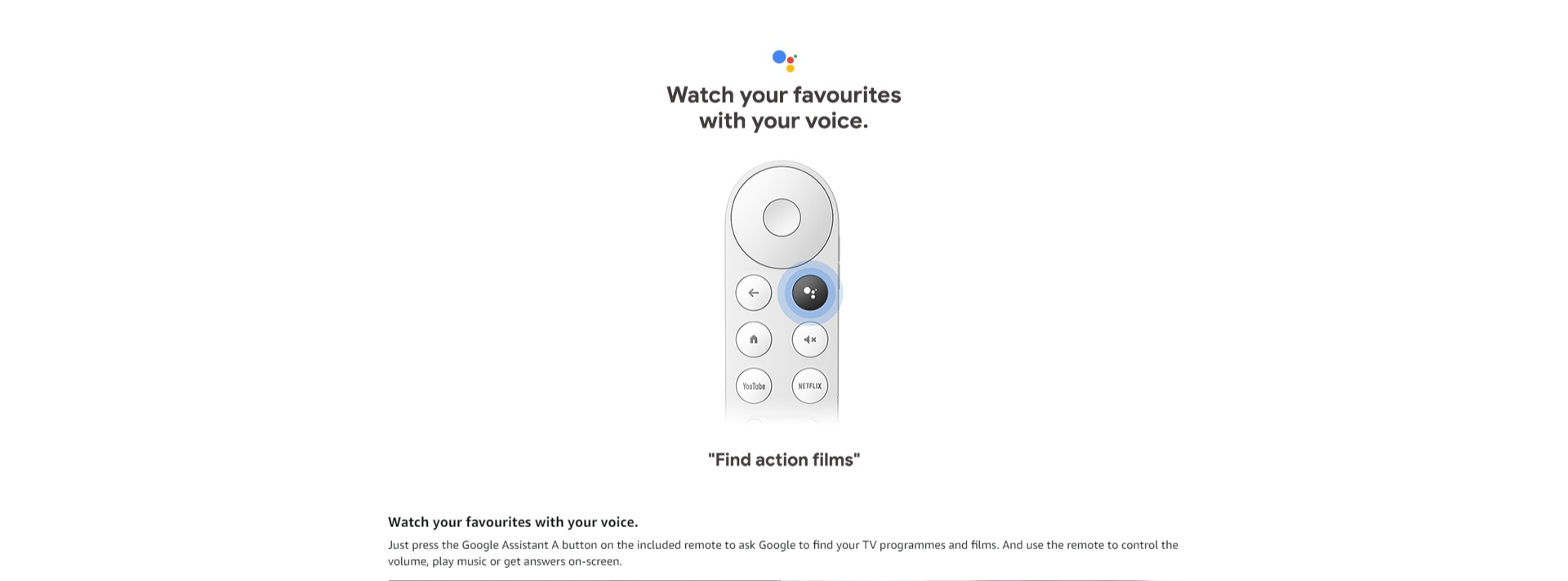 - Use your voice. Press the Google Assistant button on the remote and ask to search for specific TV programmes, or by mood, genre, actor and more, Ask Google and say, “What should I watch?” And use the remote to control the volume, switch inputs, play music and get answers on-screen.