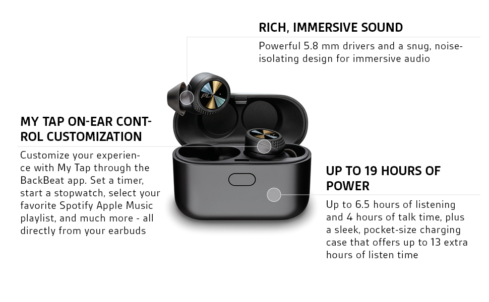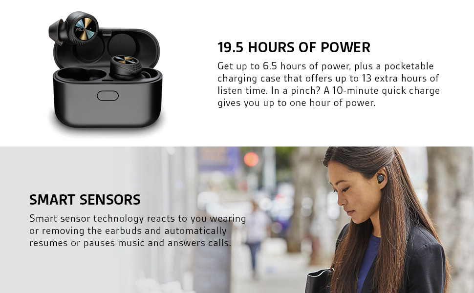 - Compatibility: Listen/Talk/Standby Time - Up to 6.5 hours listen time, Up to 4 hours talk time. Roaming Range - Up to 33 feet/10 meters. Charge Time - Up to 2 hours for full charge, Up to 3 hours for full charge of earbuds and charging case.