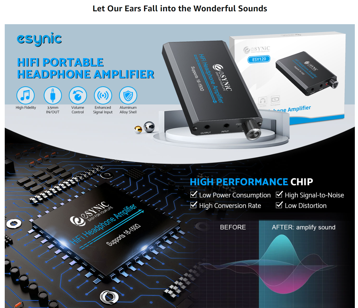 - This eSynic Protable Headphone Amp Snr>100Db and Thd+N 0.0003%, Make it Possibility to Output not Just Louder Sound, But a Sharper and More Real Stereo Sound without Distortion. Let Us Be Enjoy in the Wonderful Sound.