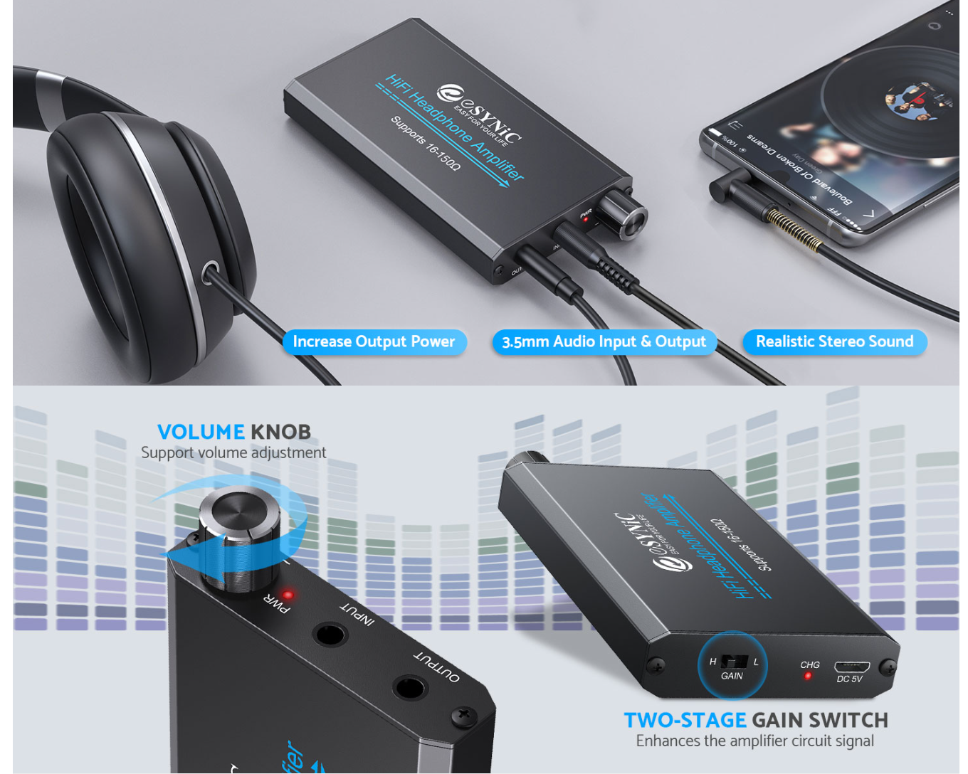 - Our eSynic Professional Headphone Amplifier Rechargeable With Two-Stage Gain Switch Which Enhances the Signal Input Into the Amp Circuit for Optimal Performance of the Headphones.And Support 3.5mm Headphone Jack Input and Output.