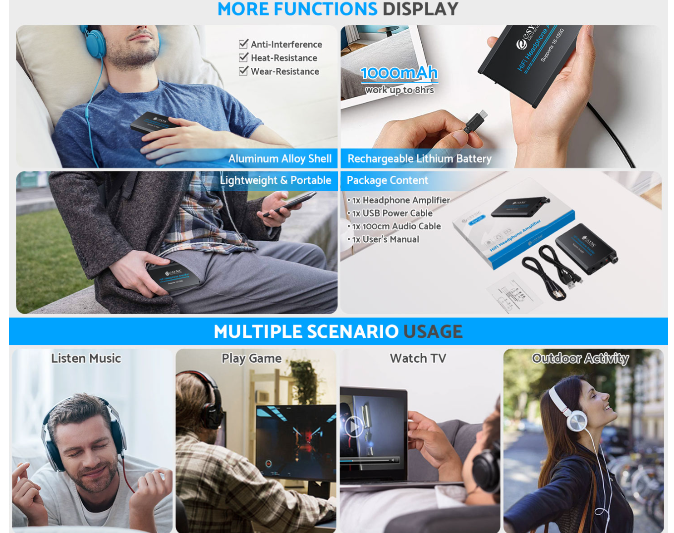 - Our eSynic Portable Headphone Amplifier Made of the Aluminum Matte Surface Makes it More Sturdy with No Signal Interference.Great Heat-Resistance, Stable Performance Durability and High Quality Ensured. Achieve Noise Reduction, and Lossless Transmission.