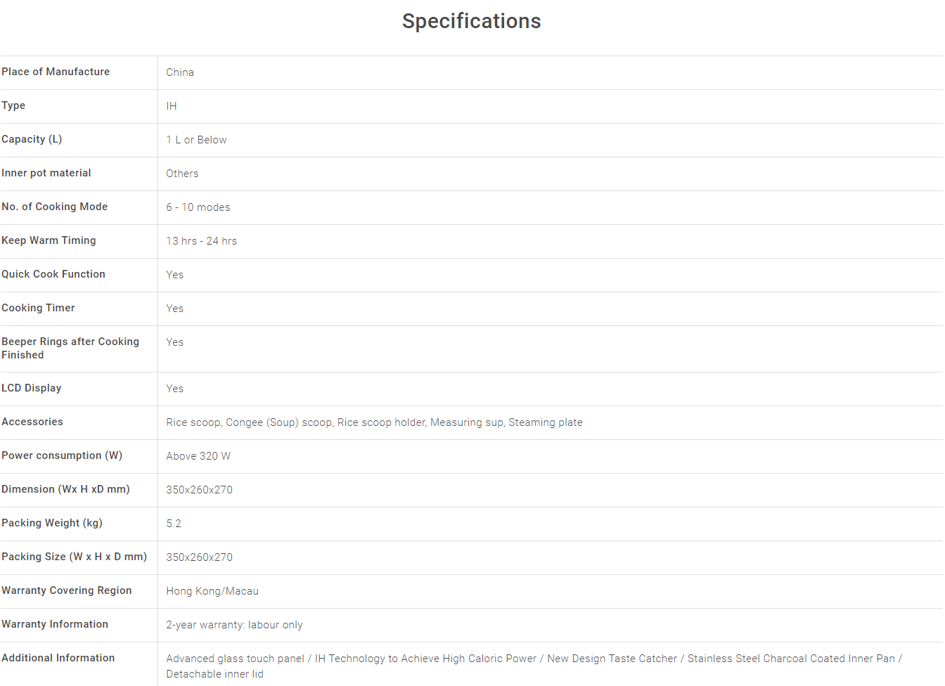 - Cooking programs: White Rice (Regular / Delicious / Quick), Rice Reheat, Soup / Congee (40-180 minutes), Steam, Noodle, Mixed Rice, Yogurt & Steam
