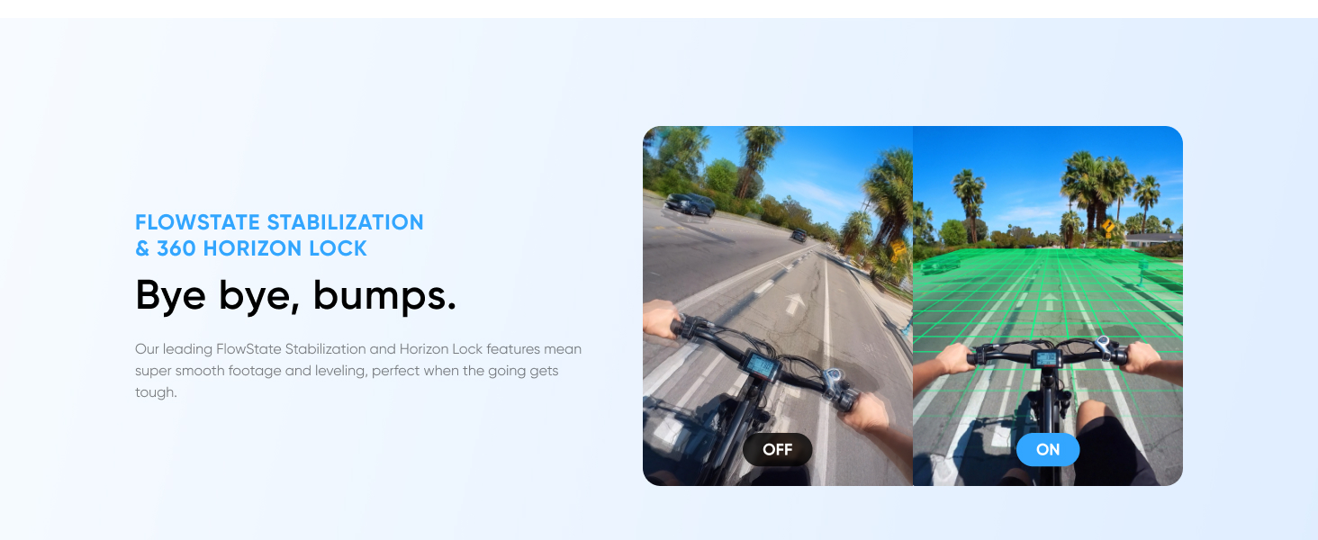 - FlowState Stabilization & 360 Horizon Lock: Insta360's FlowState Stabilization removes all the shakes, bumps, or rolls. 360 Horizon Lock allows video to stay upright no matter what.