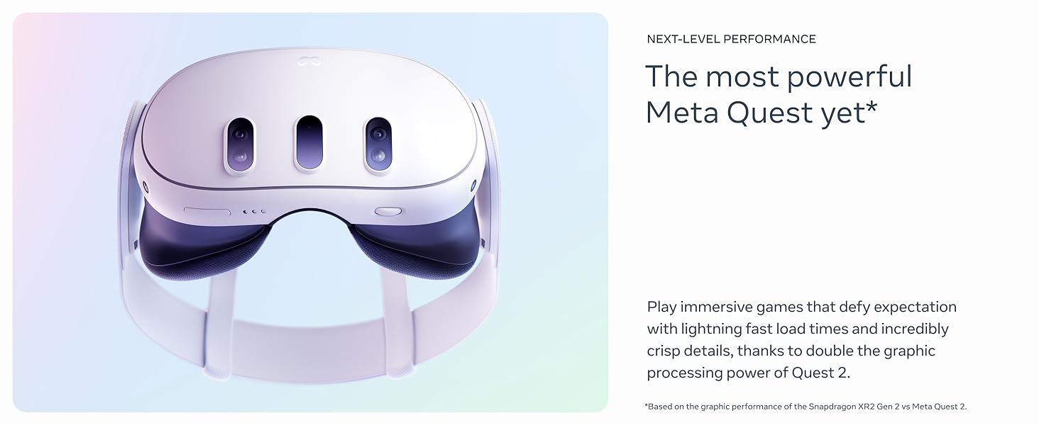 - It’s the most powerful Quest yet*, featuring next-level performance with more than double the graphic processing power of Quest 2. (*Based on the graphic performance of the Snapdragon XR2 Gen 2 vs Meta Quest 2.)
