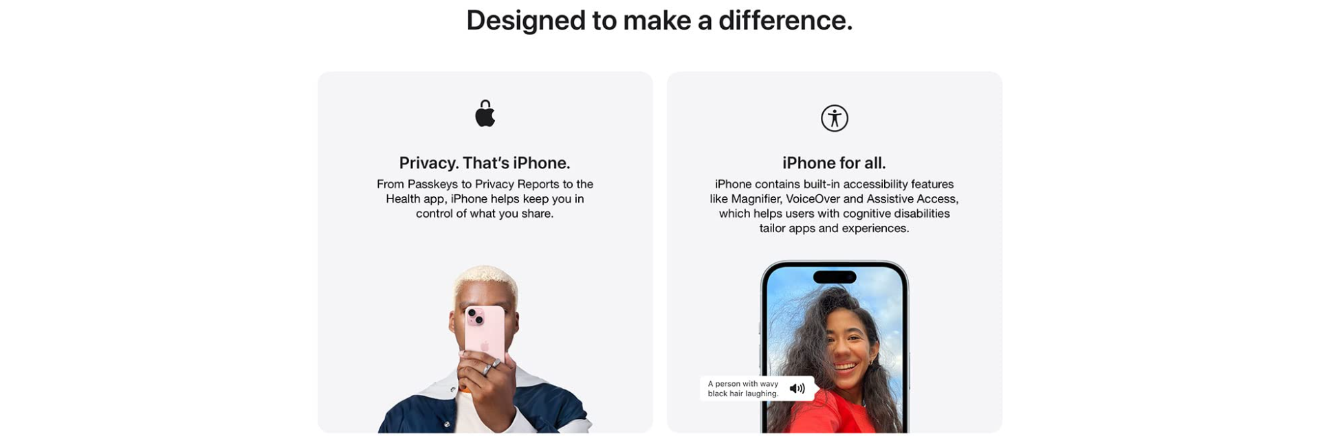 • DESIGNED TO MAKE A DIFFERENCE — iPhone comes with privacy protections that help keep you in control of your data. It’s made from more recycled materials to minimise environmental impact. And it has built-in features that make iPhone more accessible to all.