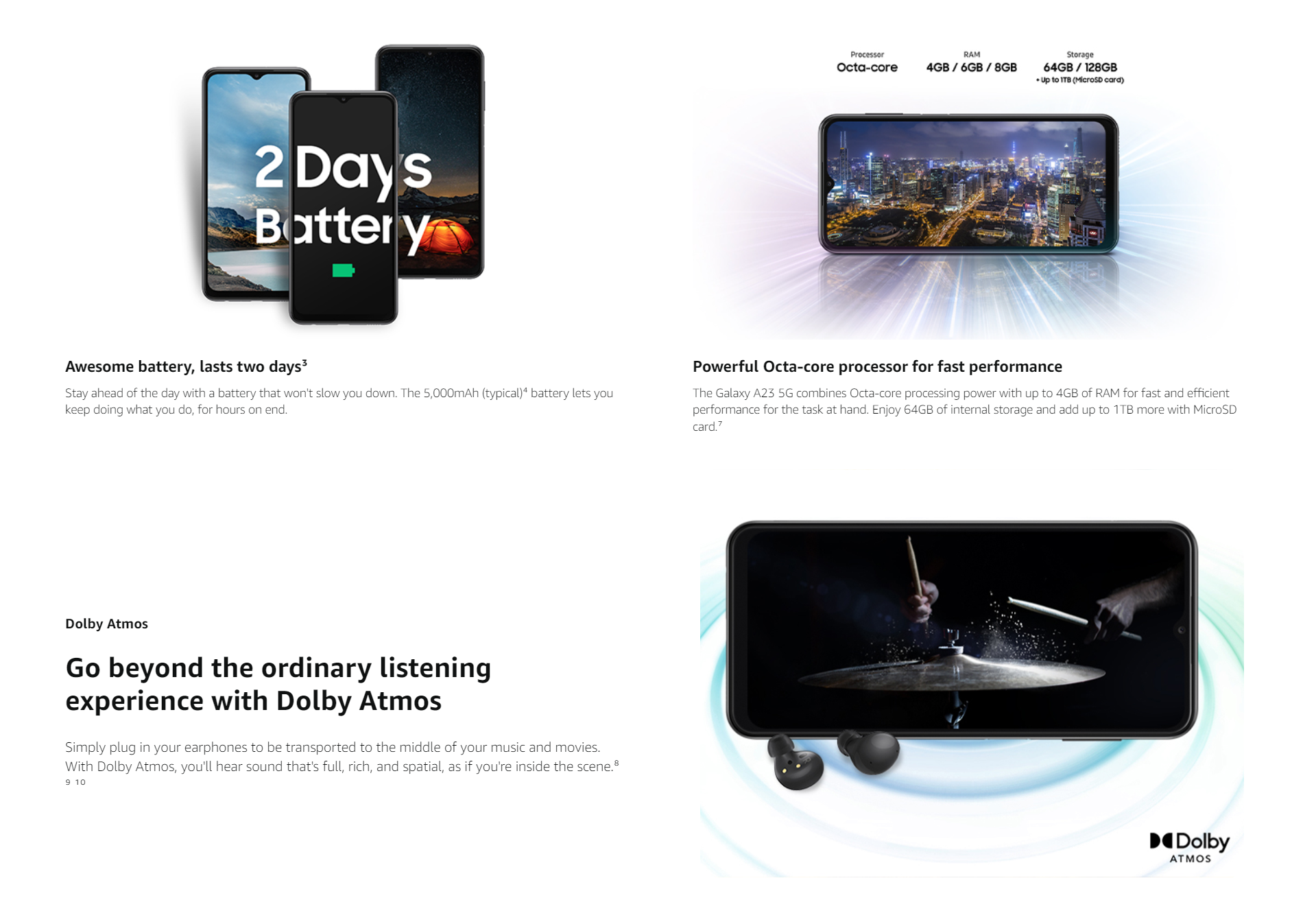 - Strong Performance – The Galaxy A23 combines Octa-core processing power with up to 6GB of RAM for fast and efficient performance for the task at hand. Enjoy 128GB of internal storage and add up to 1TB more with MicroSD card.