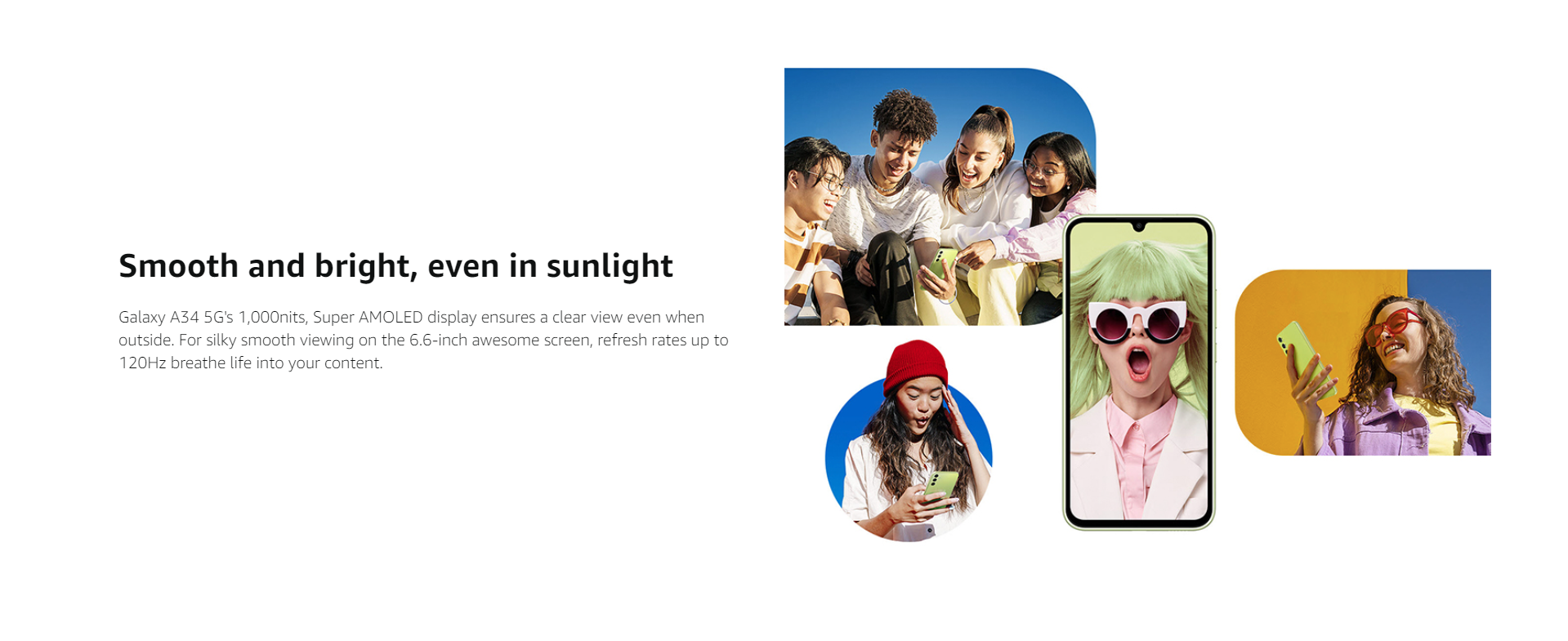 • Galaxy A34 5G's 1,000nits, Super AMOLED display ensures a clear view even when outside. For silky smooth viewing on the 6.6-inch awesome screen, refresh rates up to 120Hz breathe life into your content.
