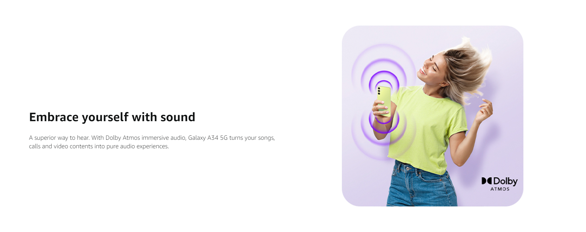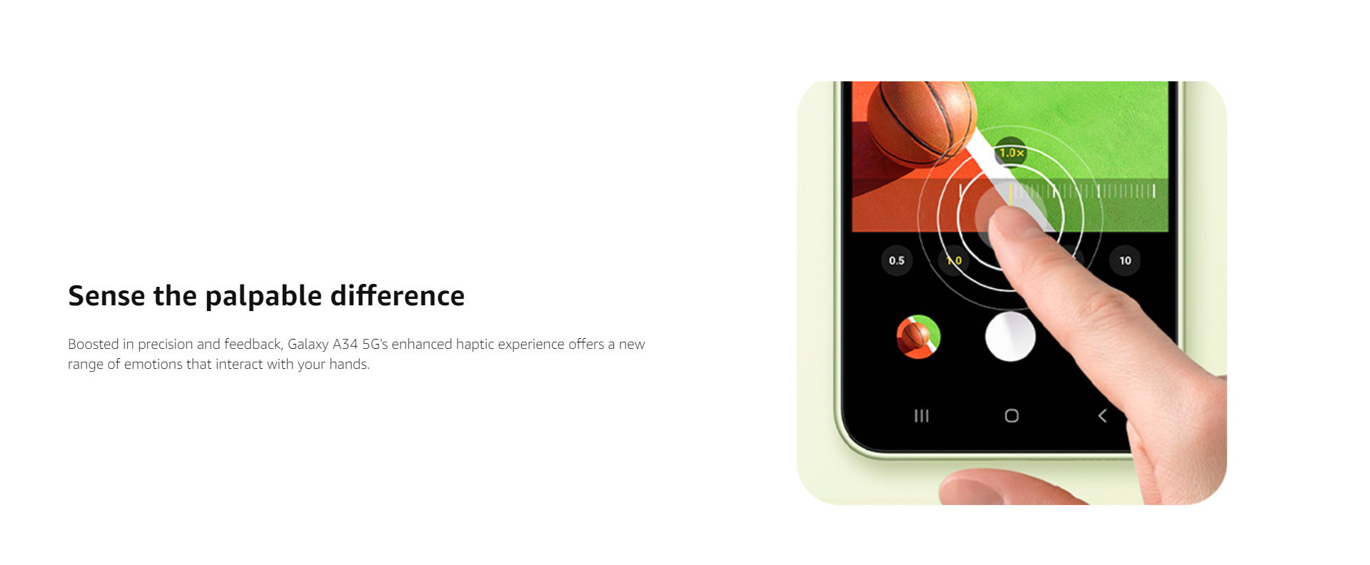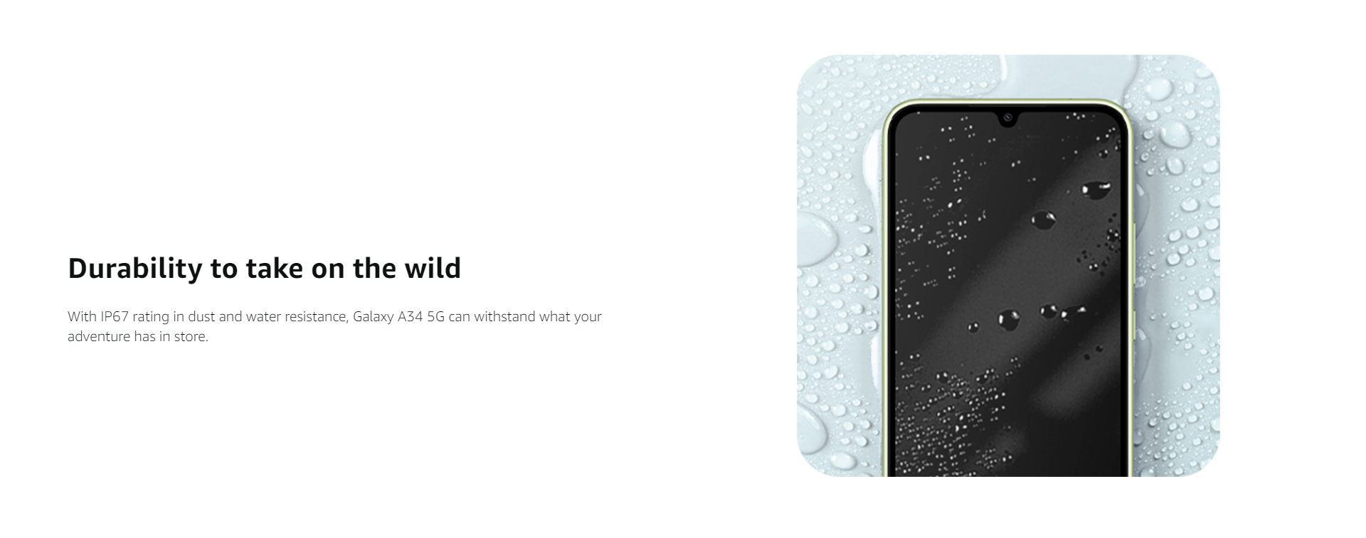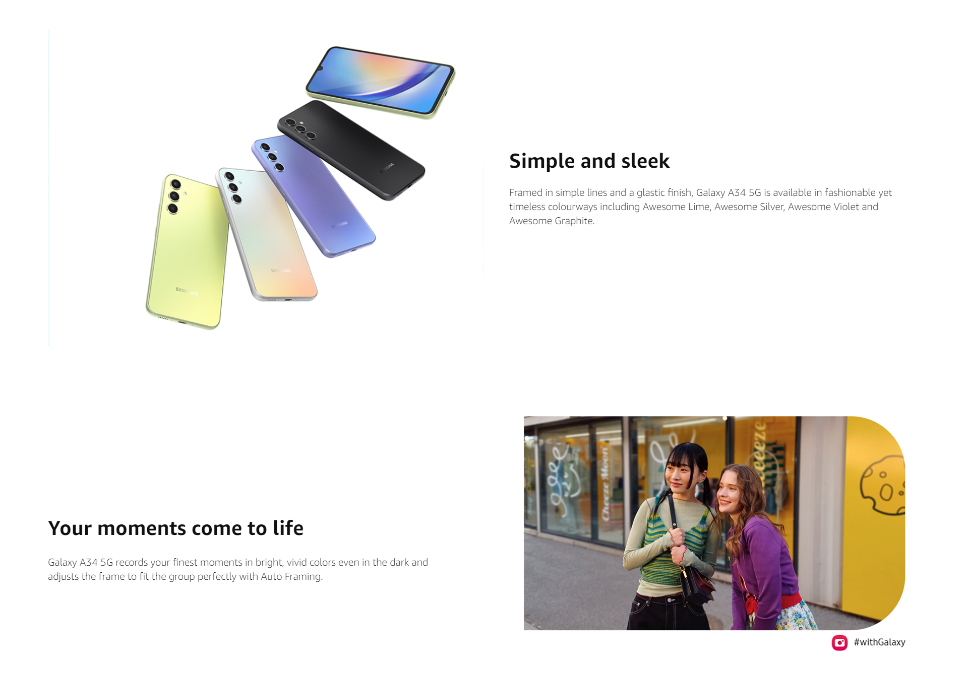• Simple and sleek: Framed in simple lines and a glastic finish, Galaxy A34 5G is available in fashionable yet timeless colorways