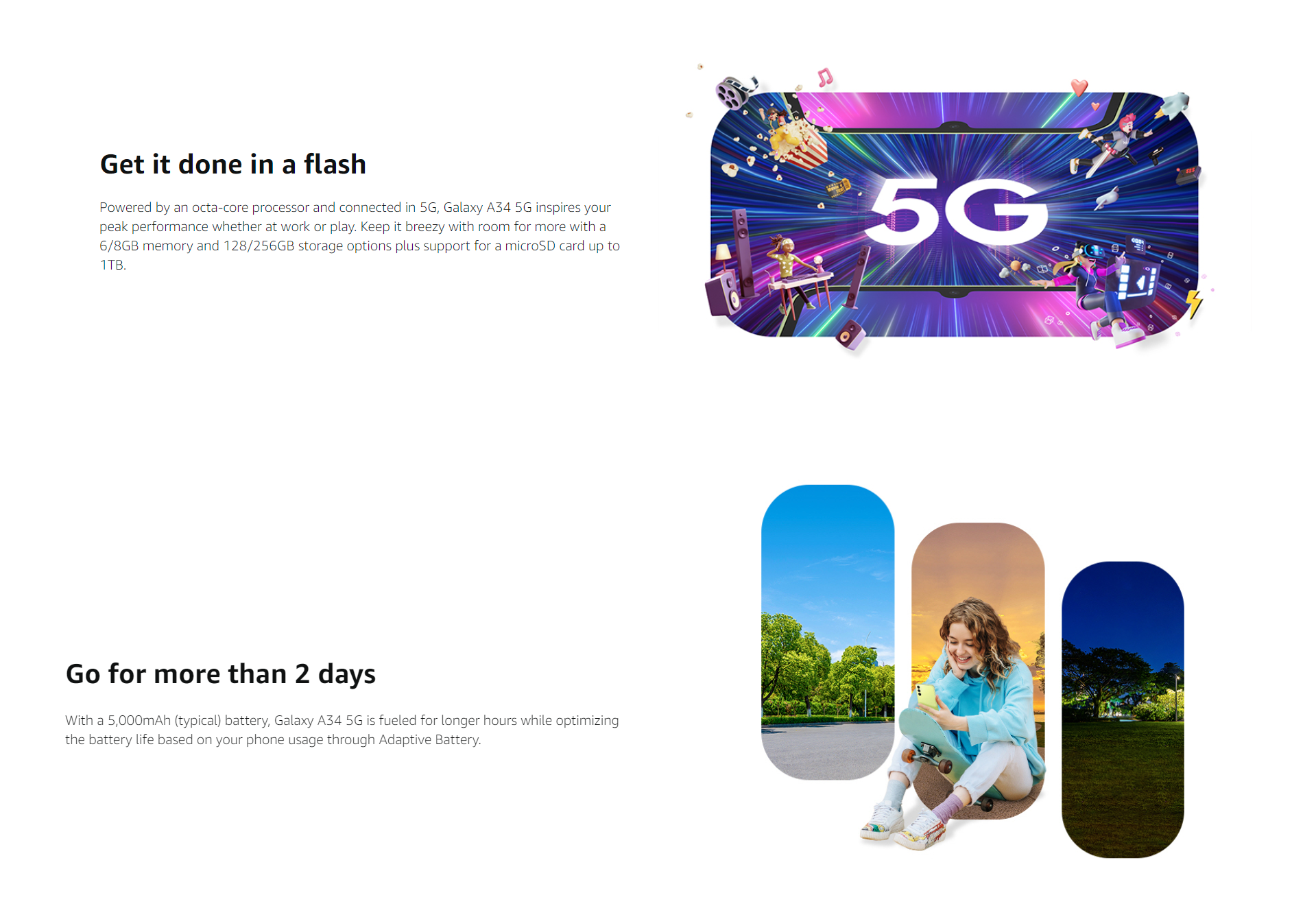 • Get it done in a flash: Powered by an octa-core processor and connected in 5G, Galaxy A34 5G inspires your peak performance whether at work or play