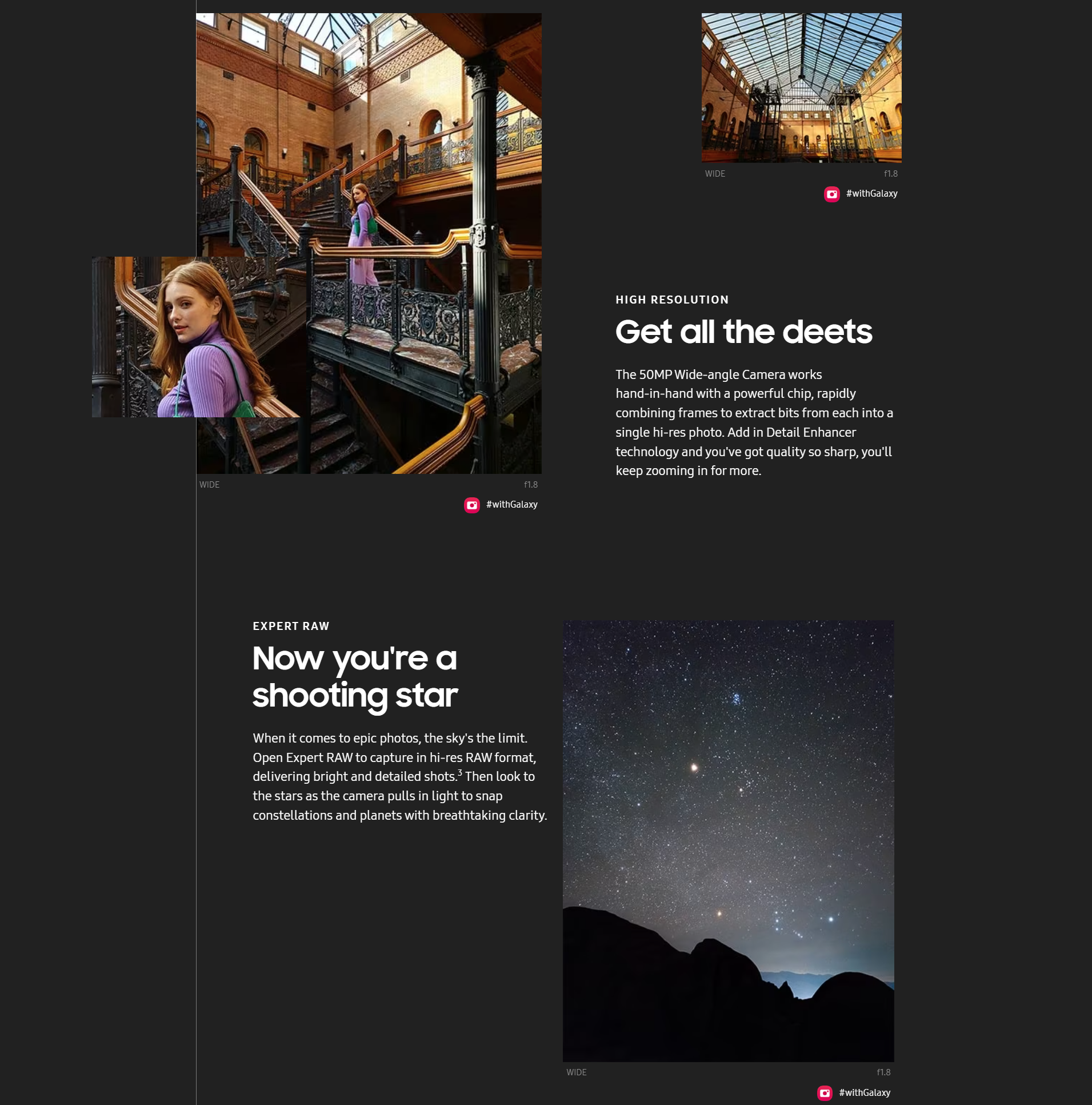 • The 50MP Wide-angle Camera works hand-in-hand with a powerful chip, rapidly combining frames to extract bits from each into a single hi-res photo. Add in Detail Enhancer technology and you've got quality so sharp; you'll keep zooming in for more.
