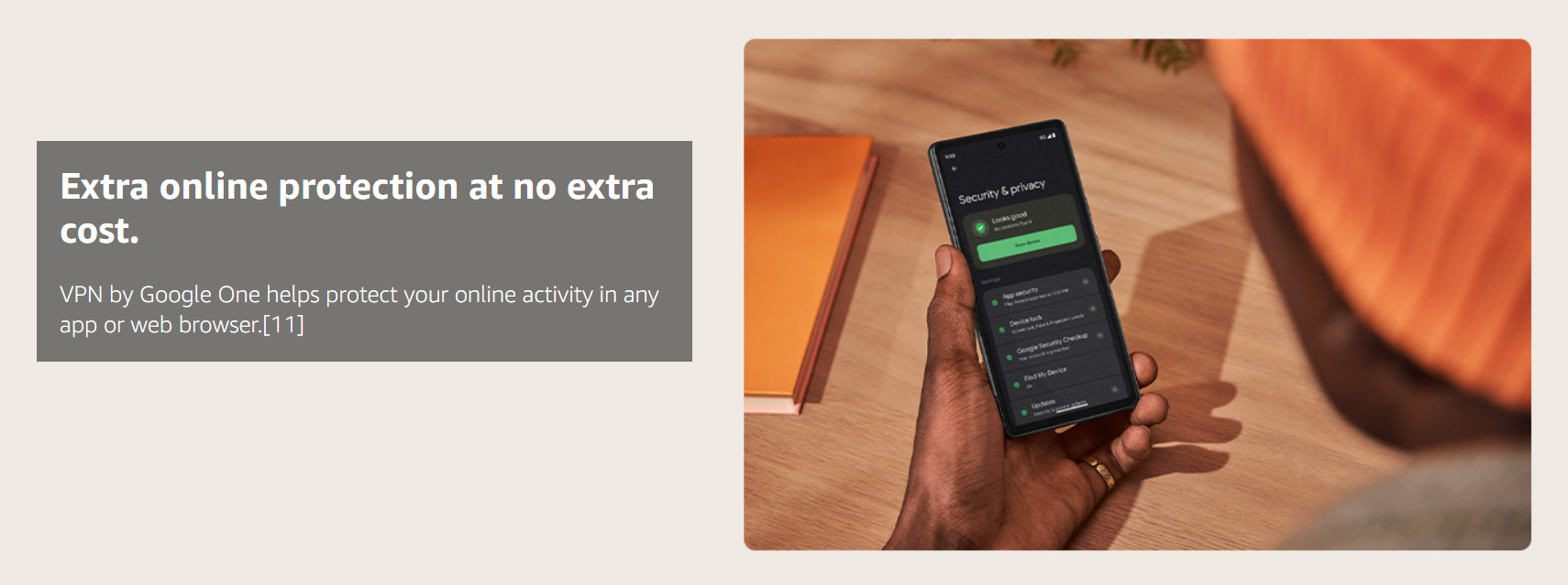 - Google Tensor G2 and the certified Titan M2 chip add layers of security to keep your personal info safe; VPN by Google One helps protect your online activity in any browser