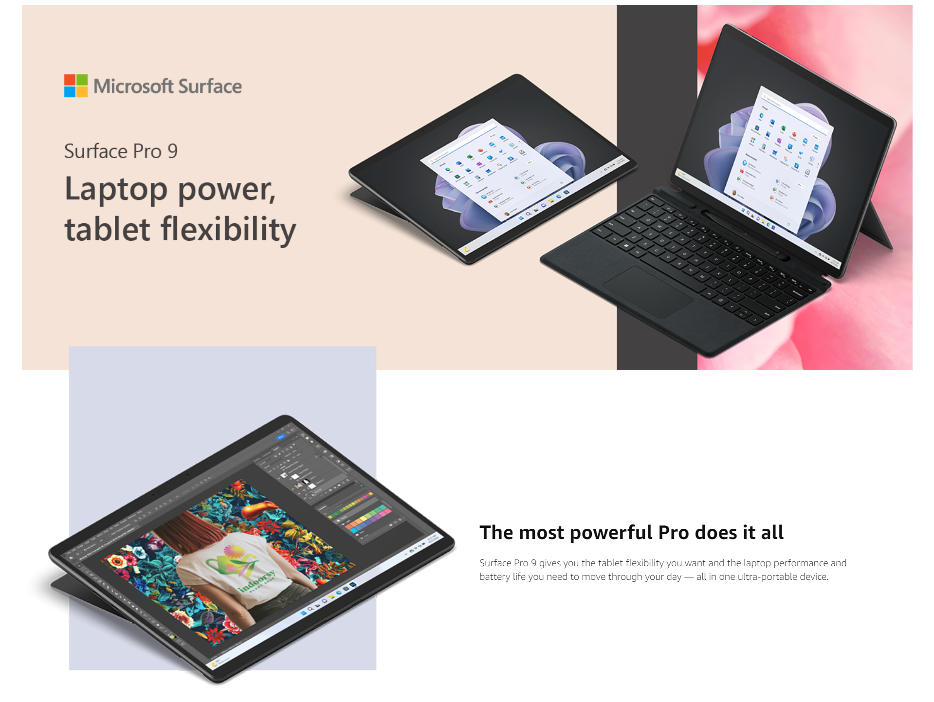 • Surface Pro 9 combines laptop-level performance with the flexibility of a tablet for people who want both power and versatility to move throughout their day – all in one device