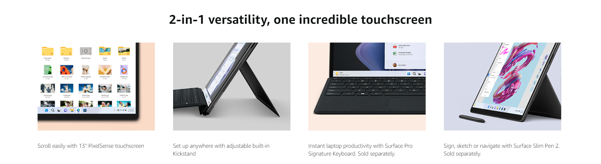 • Expect more from your computer - Immerse yourself in the virtually edge-to-edge display. Adjust to the perfect angle with the built-in Kickstand. Pair with Surface Pro Keyboard. Sign, sketch, or navigate with Surface Slim Pen 2. Feel like pen on paper with tactile signals and Slim Pen 2. Adapt naturally to any position with Windows 11