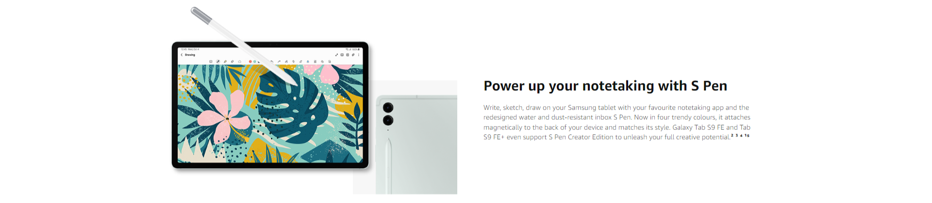 - Creative power with S Pen: Draw, sketch, and annotate freely using the redesigned, water-resistant inbox S Pen, Attach it magnetically in four tab-matching colours to the back of your device, Unleash your creativity with S Pen Creator Edition
