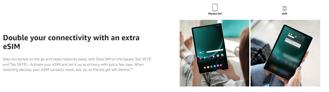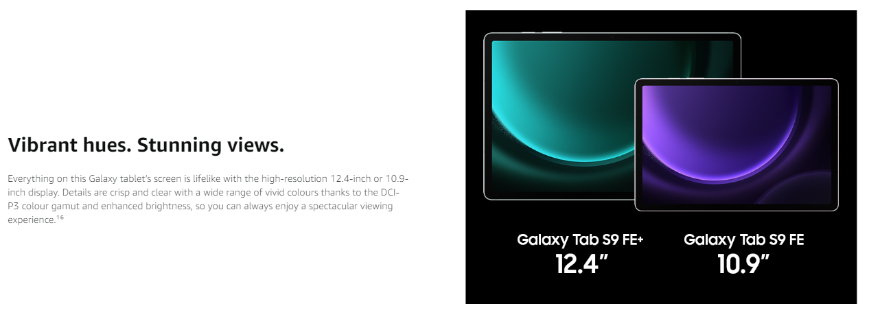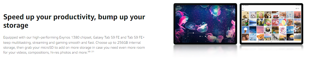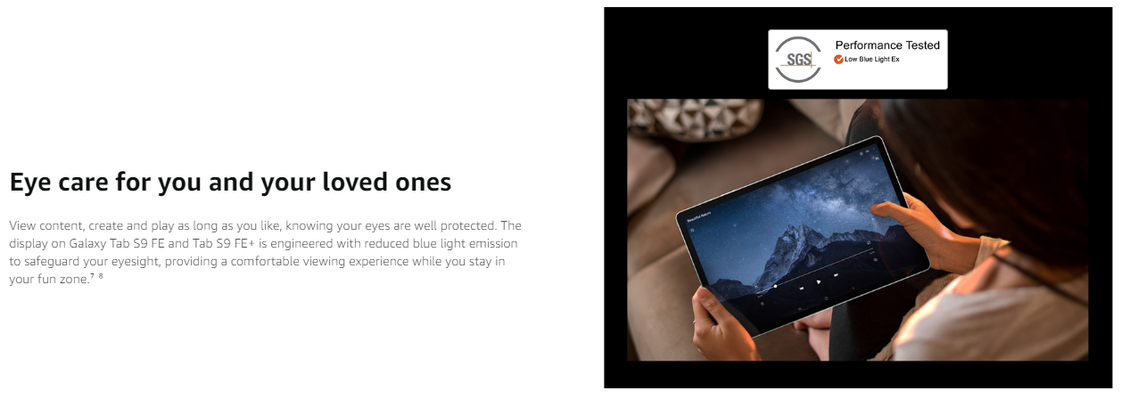 - Super-smooth media with true-to-life motion: Comfortable viewing at up to 90Hz adaptive refresh rate while you binge-watch, scroll, or edit, Galaxy Tab S9 FE and Tab S9 FE+ displays protect your eyes with reduced blue light emissions
