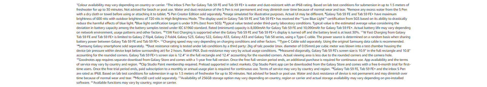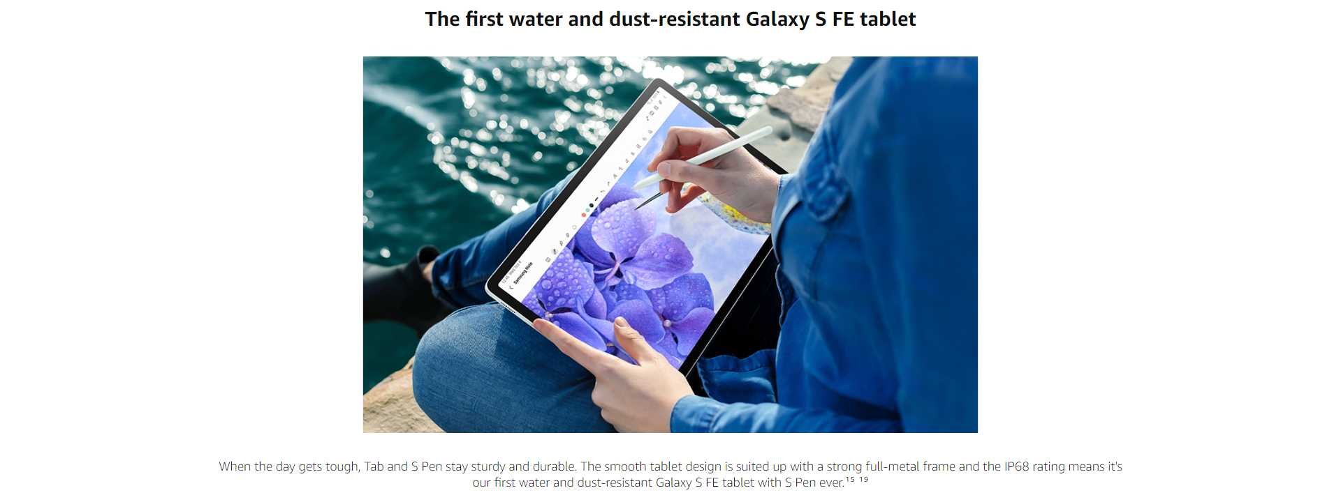 - Long-lasting and durable: Creativity on the move with a robust battery, full-metal frame, and IP68 rating, making the Galaxy S FE tablet with S Pen water and dust-resistant for tough conditions on the go